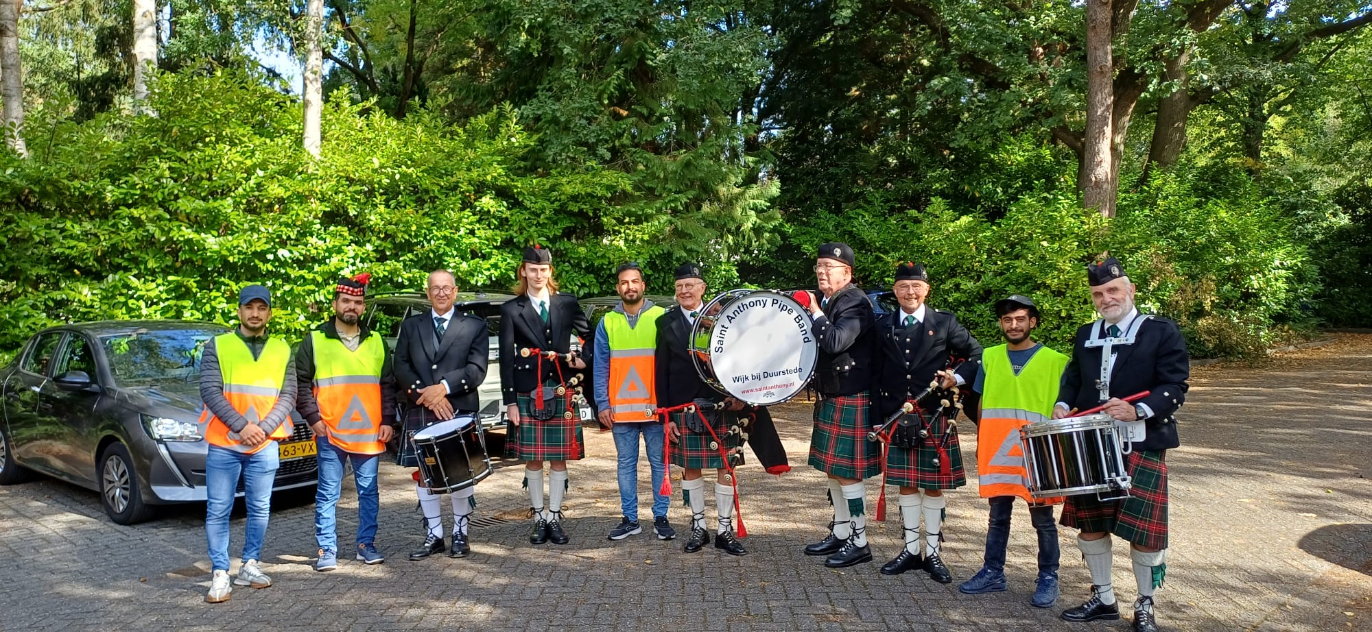 Het Raadhuis Maarn bestaat 100 jaar en dat werd een echt dorpsfeest. Wij gingen gewoon achter de muziek aan, maar de verkeersregelaars van het AZC liepen juist ook voorop. Vanaf De Twee Marken werden de St. Anthony Piper Band en de vrijwillige drumfanfare van de Koninklijke Landmacht dwars door het dorp naar het Raadhuis geloodst. En die samenwerking leverde ook dit mooie plaatje op.
