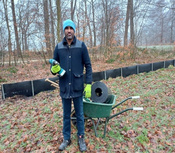 Op de foto:  Kashem helpt de Paddenwerkgroep Leersum met schermen plaatsen langs de Broekhuizerlaan.