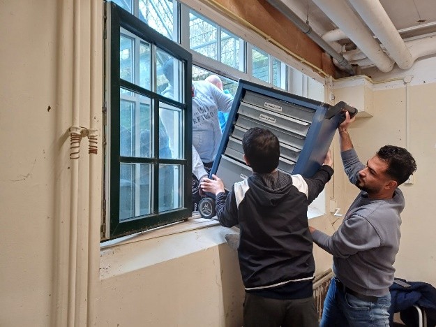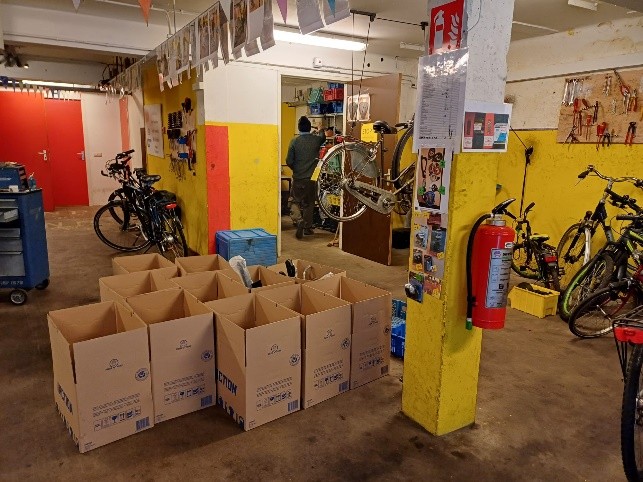 Vanwege de verbouwing van het AZC gebouw naar het AZC van de Toekomst moest de fietsenwerkplaats in januari verhuisd worden. Wij hebben nu tijdelijk plek in een ander gebouw op het terrein. Omdat de verbouwing fasegewijs gaat, zullen we waarschijnlijk nog wel vaker moeten verhuizen.